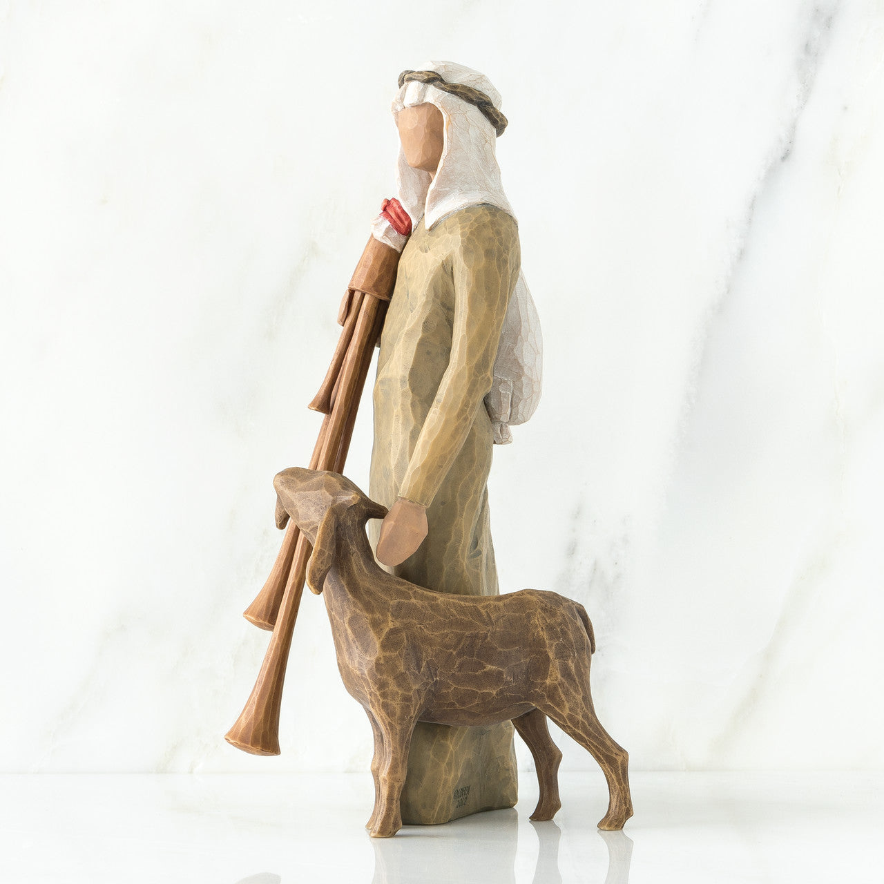 Figure in olive-colored grament with brown goat at his side, carrying set of reddish-wood bagpipes with white bag over shoulder. Sized to complement the Willow Tree Nativity Set